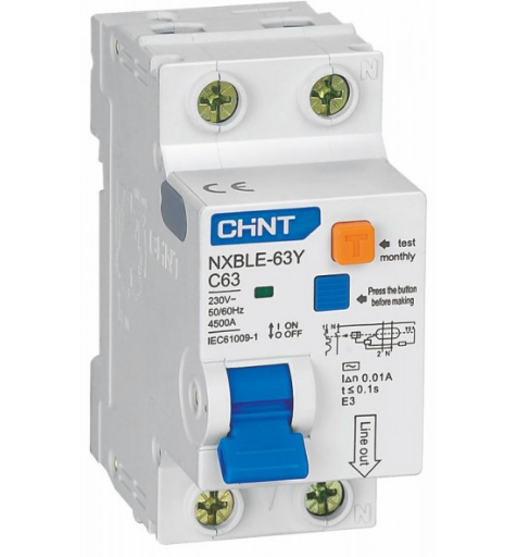 Опис:Диференціальні автоматичні вимикачі (дифавтомати) NXBLE-63Y призначені для захисту електричних ланцюгів змінного струму частотою 50-60 Гц напругою 230/400 В від витоку струму на землю, а також від перевантаження і струмів короткого замикання. Диференціальні автомати застосовуються для захисту людей від ураження електричним струмом при контакті з струмоведучими частинами